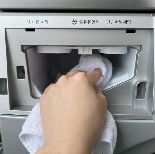✅ 세제통을 빼내고 나서 이 부분도 함께 닦아줍니다. ✅ 여기에 세제 찌꺼기와 함께 곰팡이가 많이 피는 곳이니 잘 닦아주셔야 합니다. ✅ 잘 닦지 않고 세제통만 닦아주면 빨래에서 냄새가 날 수도 있으니 이 부분까지 잘 닦아주세요.