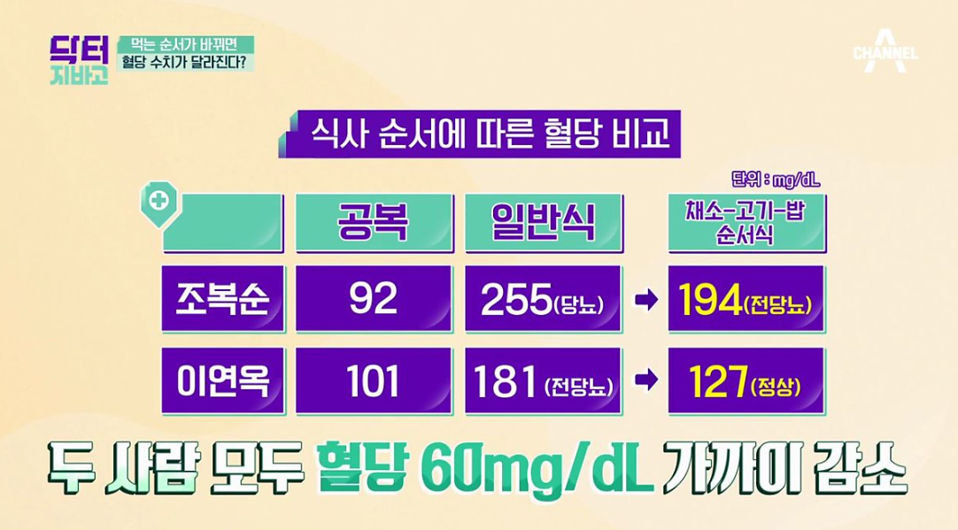 실제로 위의 순서만 달라졌을 뿐인데 혈당의 수치는 60가까이 감소했습니다. 각각 194, 127로 당뇨 전단계와 정상으로 나왔습니다.