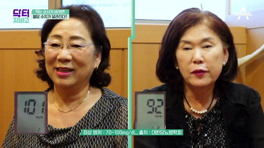 위의 사진에 보이는 혈당은 실제로 두 분의 식사전 혈당 수치인데요. 101, 92로 정상 혈당 수치입니다. 일단 원하는 순서대로 자유롭게 식사를 해봤는데요.