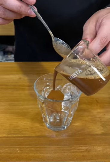 ✅ 잔에 얼음을 채우고 믹스커피와 카누 섞은 커피를 부어줍니다. ✅ 잘 섞어줍니다.