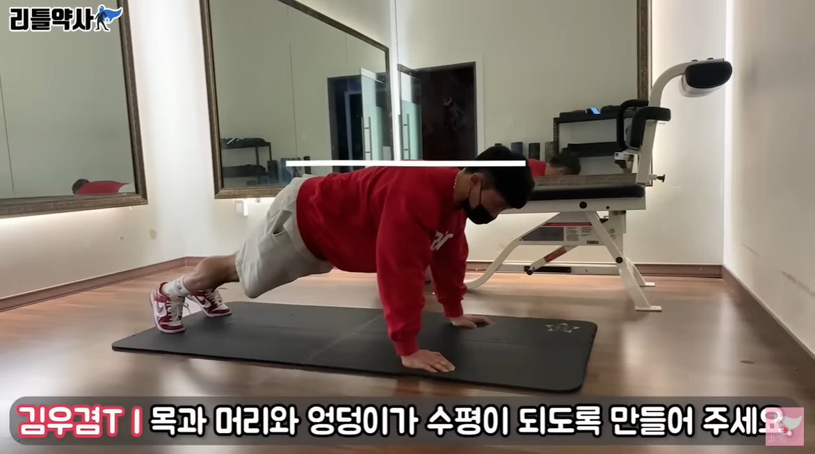 ✅ 먼저 요가 매트를 깔아주신 다음, 조그려 앉은 동작에서 양쪽 어깨에 힘을 지탱하셔서 몸을 고정시키시고, 한 발씩 무릎을 가슴에서 떼셔서 뒤쪽으로 수평이 되게 뻗어 주세요. ✅ 한발 한발을 뒤로 빼서 엎드려 뻗치는 자세를 만들어 주시는데, 이때 중요한 것이 엉덩이가 너무 높거나 낮게 되면 어깨에 부담이 될 수 있기 때문에 목과 머리, 엉덩이가 수평이 되시도록 만들어주시는 것이 중요합니다.