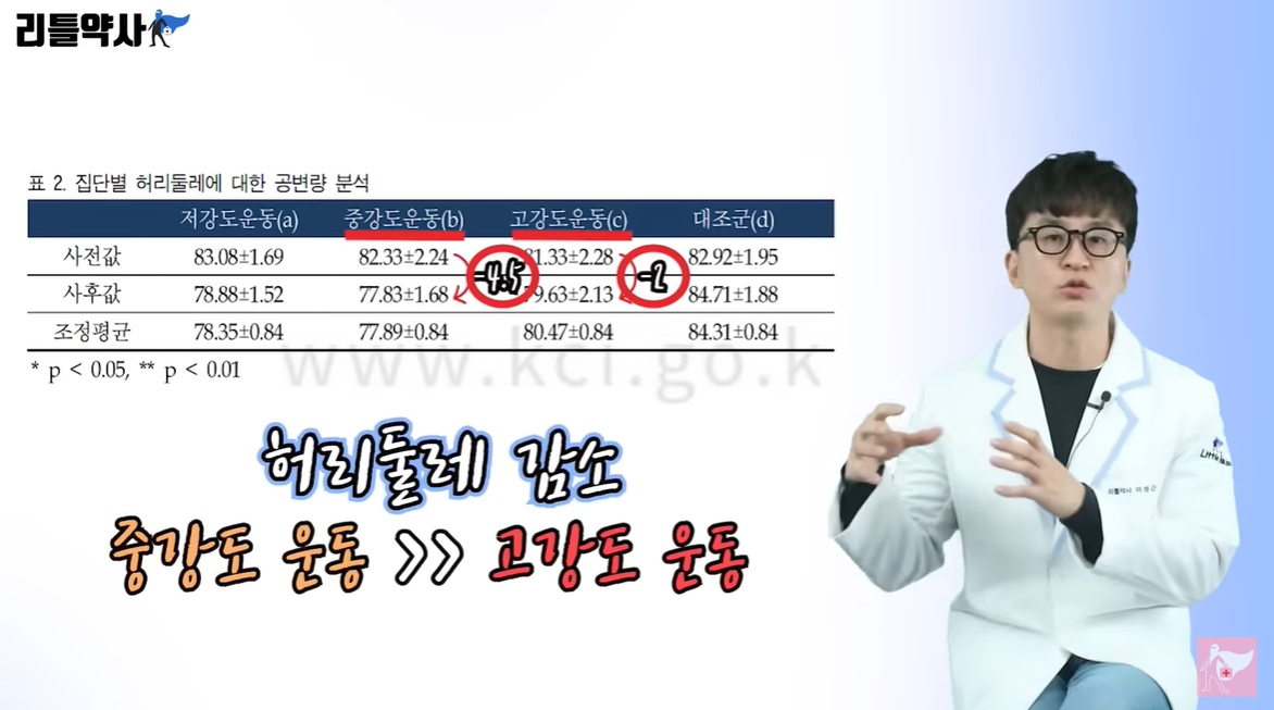 ✅ 2017년 발표된 울산대학교 논문의 내용을 보면 고강도 운동 그룹보다 이 중강도 정도 운동 그룹에서 허리둘레가 조금 더 감소되었고, 혈압 또한 고강도 보다는 중강도에서 더 낮아졌다라고 합니다. ✅ 즉, 고강도 운동은 효과가 나타날 때까지 지속하기가 어렵기도 하고, 무리하게 에너지를 쓰는 과정에서 혈압이 좀 더 오를 수도 있고, 건강에 부담이 될 수도 있다라는 의미입니다. ✅ 한마디로 무리하지 않는 선에서 중간 정도의 강도로 꾸준하게 운동을 하는 것이 지방도 좀 태울 수 있고, 30분 이상의 지속성도 있기에 결과적으로 더 효과적이다라는 의미입니다.