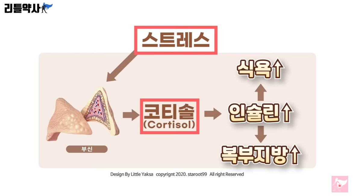 뱃살을 없애기 위해서는 적절한 스트레스 해소법이 있는게 좋습니다. 우리가 스트레스가 쌓여 적절히 해소되지 못하면 부신이라는 신체 기관이 있는데, 이 부신에서 스트레스 저항호르몬인 ‘코티솔’ 과다 분비되어 인슐린 저항성을 불러일으켜 점차적으로 식욕을 증가, 복부 지방 늘어나게 하는 원인이 된다고 합니다. 그러니까 뱃살 빼려면 반드시 운동,식단 관리, 스트레스 관리도 필수라는 거 잊지 마시길 바라겠습니다
